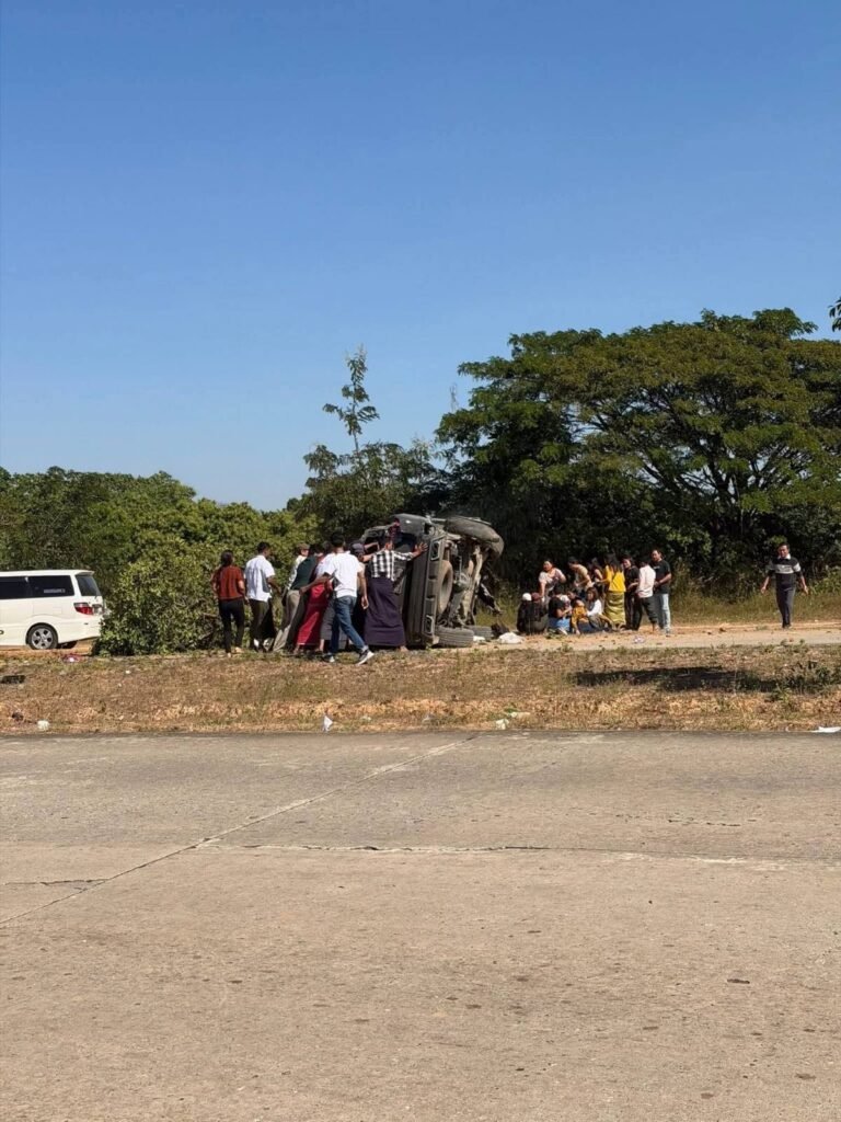 ” ခရီးသည်တင်ယာဥ်က လမ်းမှန်တယ်။ အိမ်စီးကားက (တဖက်ယာဥ်ကြောနေ) လမ်းဒီဘက်ချိုးမယ့်အခြေနေမှာ လမ်းမှန်နဲ့သွားတွေ့တာ။ အိမ်စီးကားဖင်ကိုတိုက်ပြီး စီယာတိုင်ကိုညာဘက်ဆွဲလိုက်တော့ လမ်းဘေးကာထားတဲ့တန်းတွေ သွား တိုက်မိသွားတာ။”လို့ ကူညီဆောင်ရွက်ပေးခဲ့သူတဦးက မြေလတ်အသံကို ပြောပါတယ်။