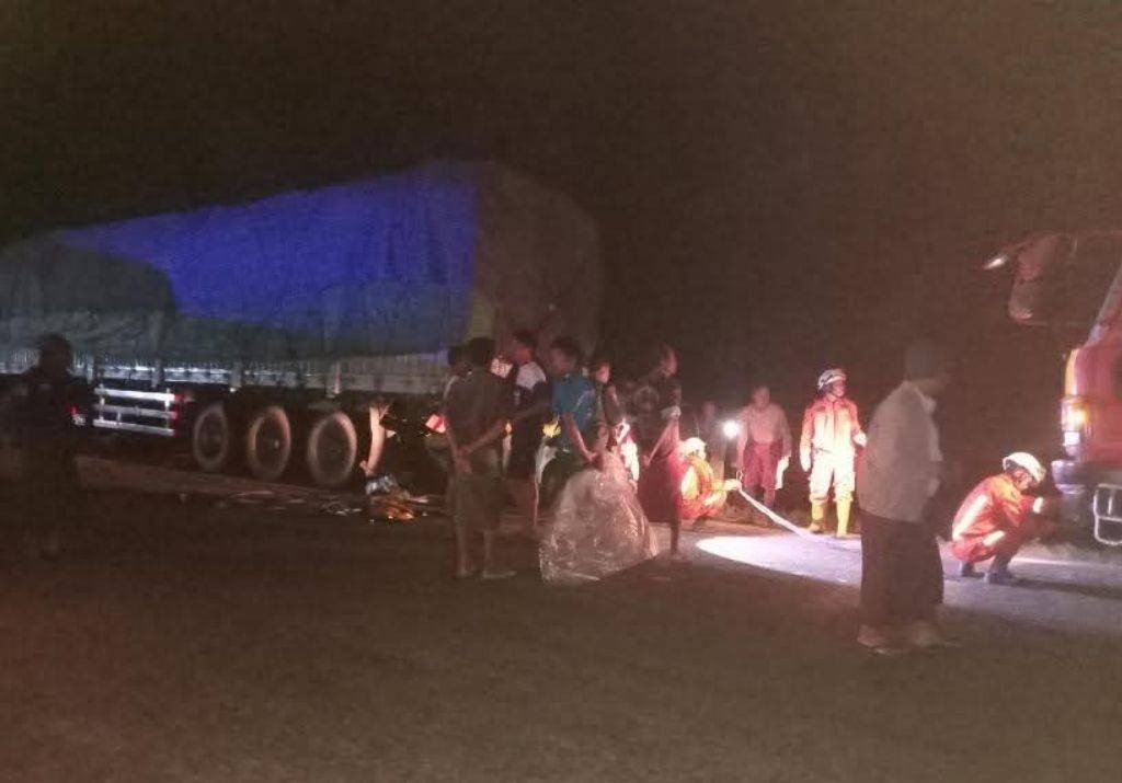 ပဲခူးတိုင်း၊ ရေတာရှည်မြို့နယ်အပိုင် ရန်ကုန်-မန္တလေးအမြန်လမ်းမိုင်တိုင် ၁၅၇/၇ အနီးမှာ ခရီးသည်တင်ကားနဲ့အိမ်စီးကားတိုက်မိပြီး ၁ ဦးသေဆုံးကာ ၃ ဦးဒဏ်ရာရခဲ့တယ်လို့ ကူညီဆောင်ရွက်ပေးခဲ့သူတွေထံကသိရပါတယ်။
