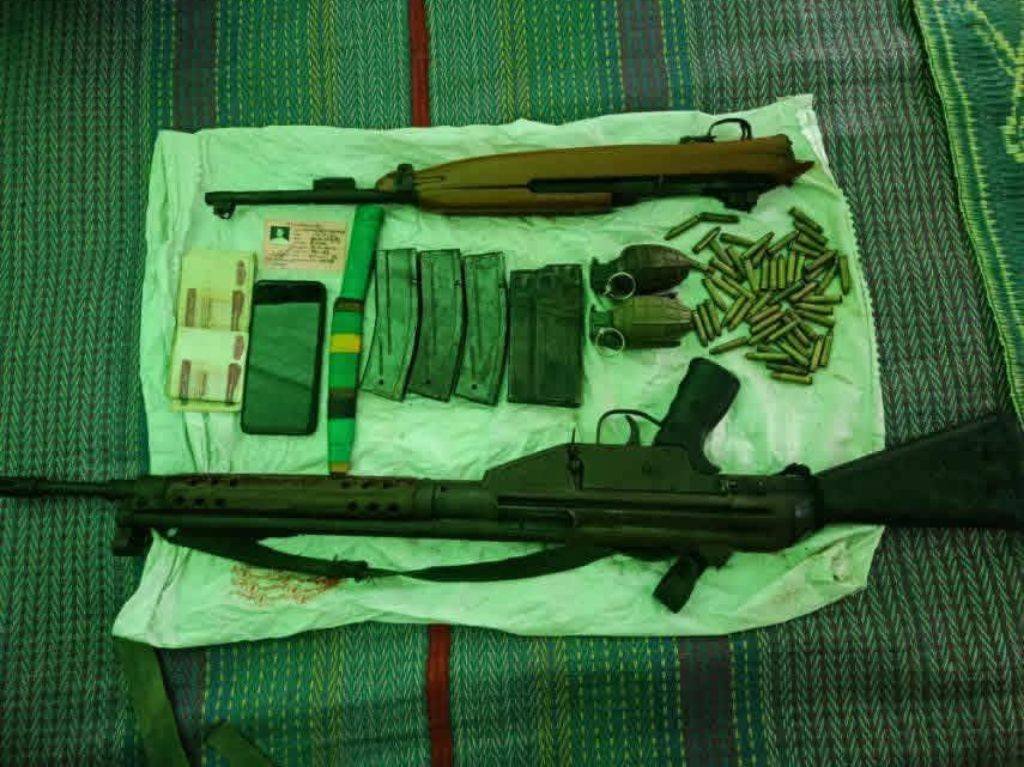 သိမ်းဆည်းရရှိတဲ့ပစ္စည်းတွေကတော့ G 3 သေနတ် ၁ လက်၊ ကာဘိုင်သေနတ် ၁ လက်၊ ကျည်ဘောက် ၄ ခု၊ ကာဘိုင်ကျည် ၄၂ တောင့်၊ လက်ပစ်ဗုံး ၂ လုံး၊ ဓား ၁ ချောင်း၊ ဘတ်တံဆိပ် ၂ ခု၊ မိုလ်ဘိုင်းဖုန်း ၁ လုံး၊ ငွေသား ၅၂၈,၀၀၀ ကျပ်နဲ့ မှတ်ပုံတင်ကတ် ၁ ခု တို့ဖြစ်ပါတယ်။