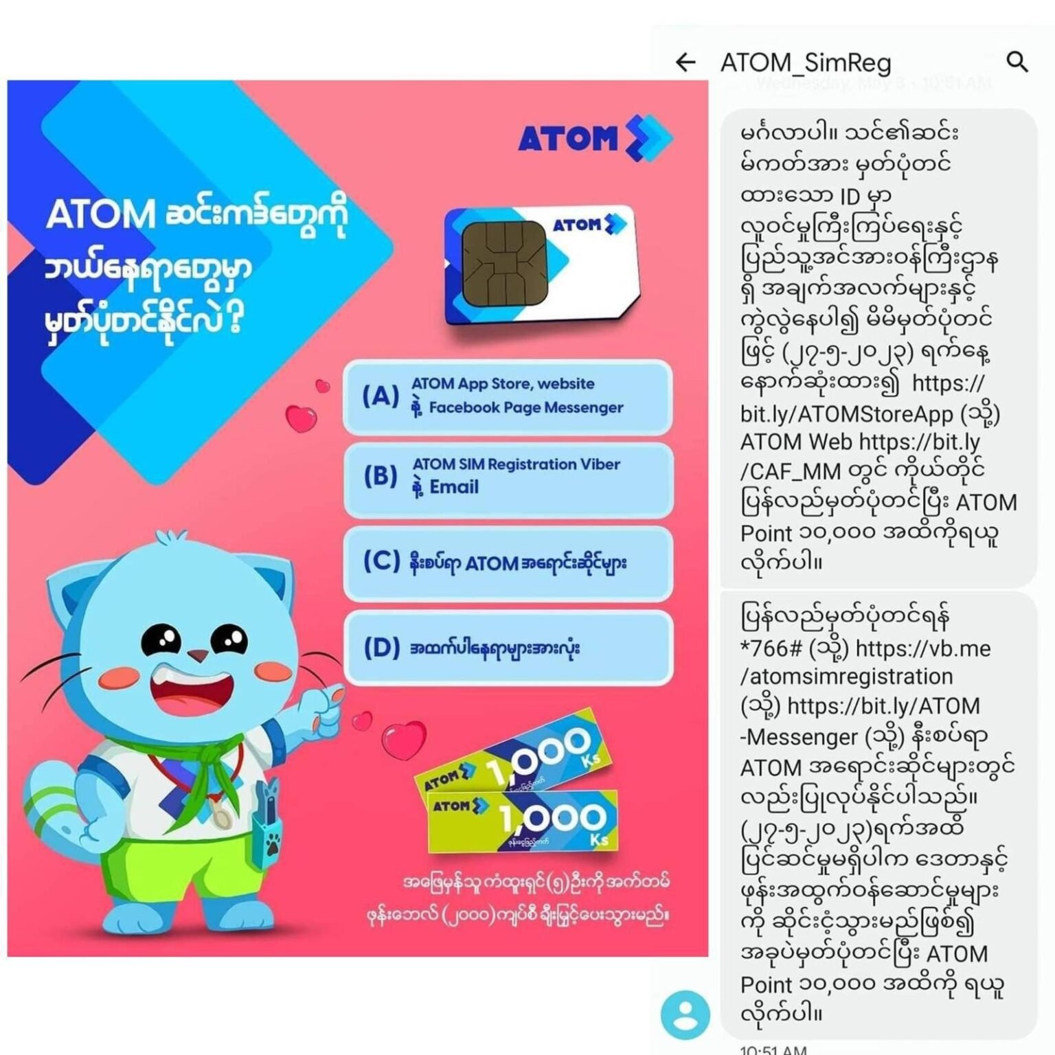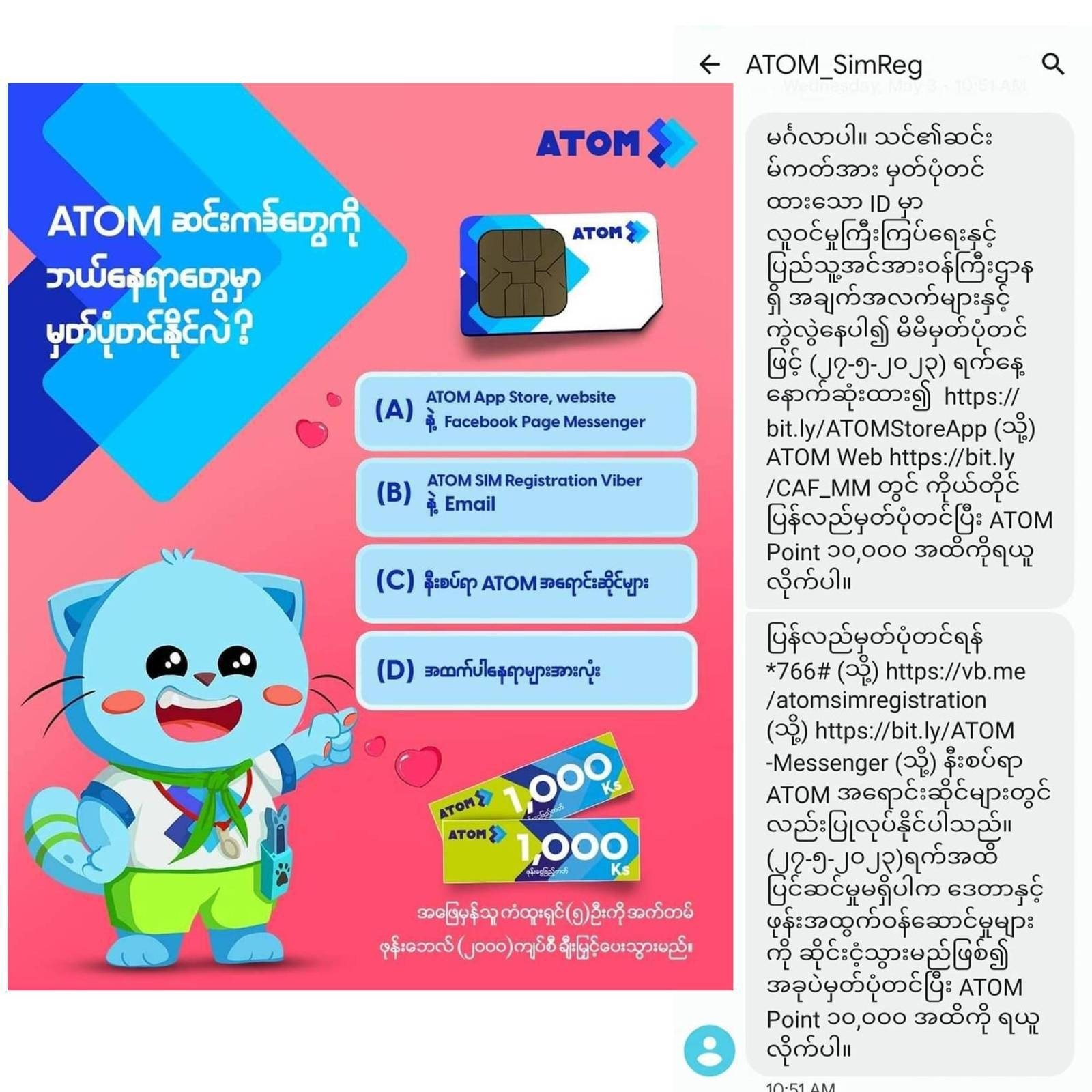 ပြီးခဲ့တဲ့ ဧပြီလက စတင်ပြီး Atom ဆက်သွယ်ရေးကုမ္ပဏီကနေ ဖုန်းဆင်းကဒ်တွေ မှတ်ပုံတင်ဖို့ အကြောင်းကြား စာတွေကို Message ကနေတဆင့်အကြောင်းကြားခဲ့တာဖြစ်ပါတယ်။ ဒါပေမဲ့ ဒေသခံတွေအနေနဲ့ ဆင်းကဒ် မှတ်ပုံတင်ဖို့အဆင်မပြေနိုင်တဲ့အတွက် ဆက်သွယ်ရေးတွေ ပြတ်တောက်ပြီး တခြားစီးပွားရေးလုပ်ငန်းတွေပါ ထိခိုက်လာမှာကို စိုးရိမ်နေတယ်လို့ မြင်းမူမြို့ခံတွေက ဆိုပါတယ်။