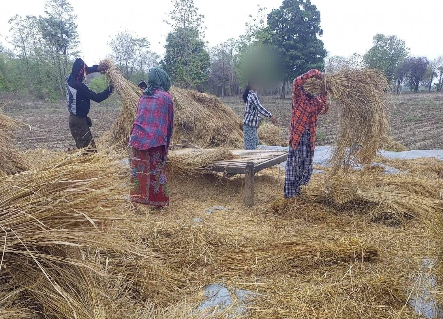 “စစ်ကြောင်းဝင်လာလို့ ဆန်တွေ့ရင်ယူပြီး သယ်သွားတယ်။ ယူမှာစိုးလို့ အိမ်မှာမထားဘဲတောထဲမှာခွဲထားကြတာ။ မုန်တိုင်းမိုးရွာတာများတော့ ဆန်တွေရေစိုကုန်တယ်။ မခြွေရသေးတဲ့စပါးတွေလည်းရေစိုပြီး အညှောင့်တွေ ပေါက်ကုန်တာပေါ့။ စစ်ဘေးရှောင်နေရသူတွေရှိတော့ အချိန်မီ မသိမ်းနိုင်ကြဘူး။ ဆန်အကျိုးအကြေတွေပဲချက်စားနေရတယ်” လို့ပြောပါတယ်။