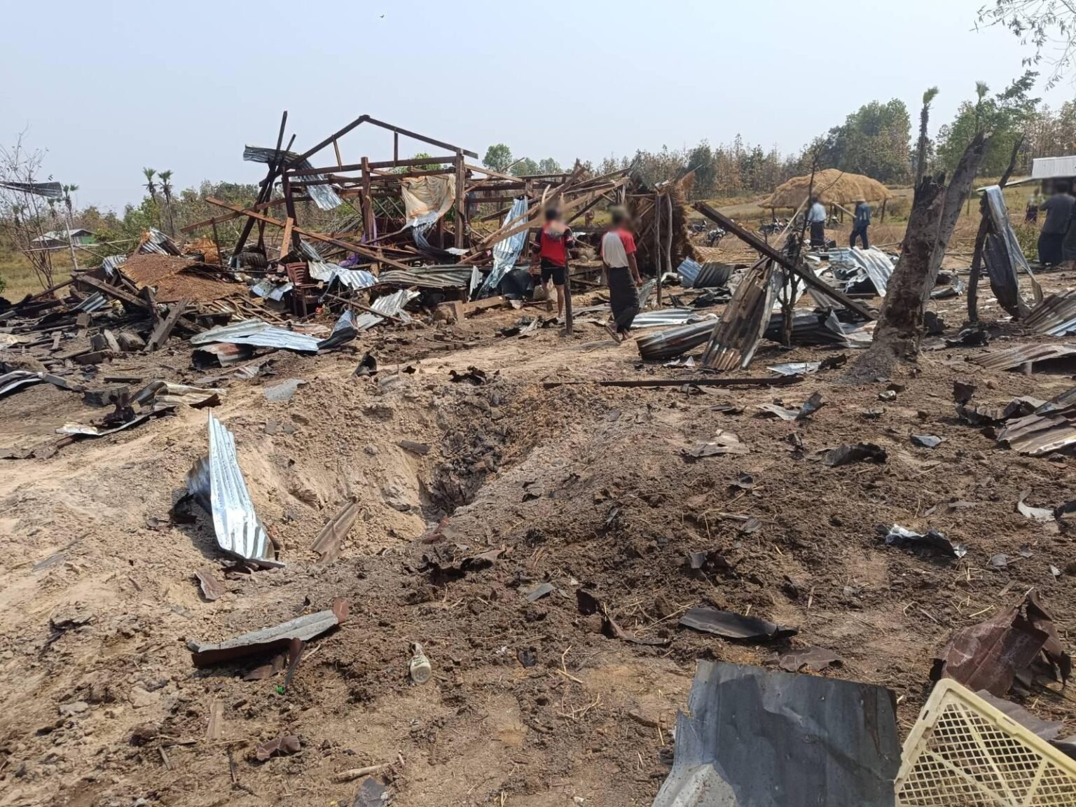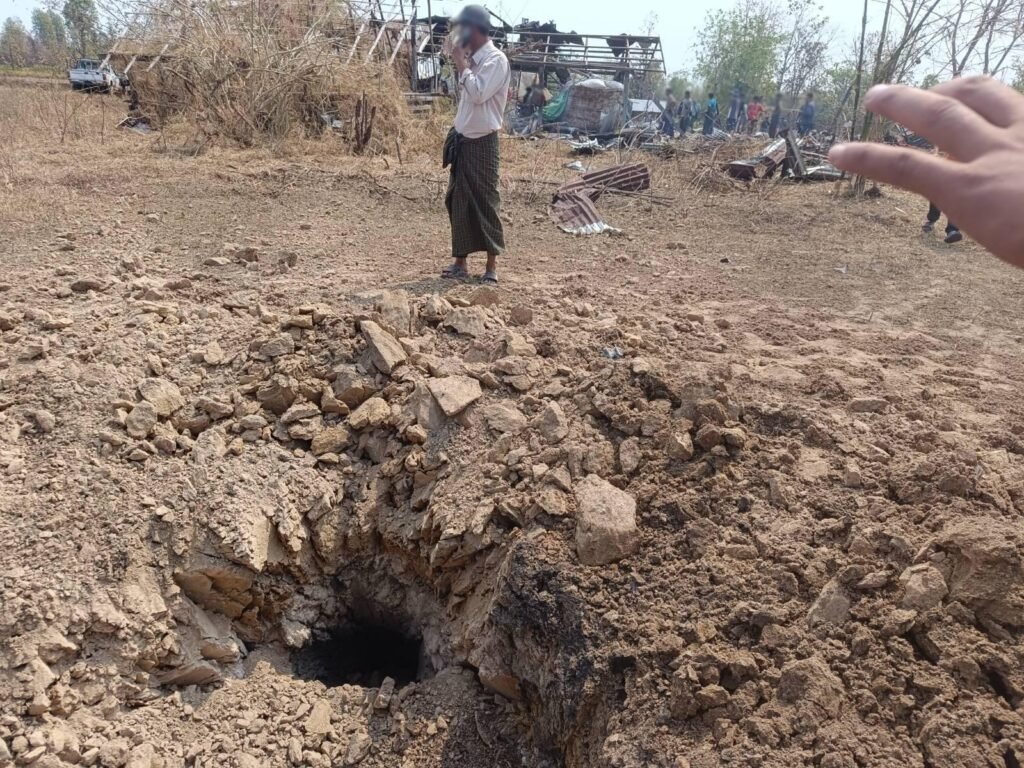 ဗုံးကြဲခံရလို့ အသက် ၄၀ အရွယ်အမျိုးသမီး ၁ ဦး နေရာမှာတင်သေဆုံးပြီး စစ်ရှောင်တွေနေတဲ့အဆောင်နဲ့ စပါးကျီ ၂ လုံး ပျက်စီးသွားပါတယ်။