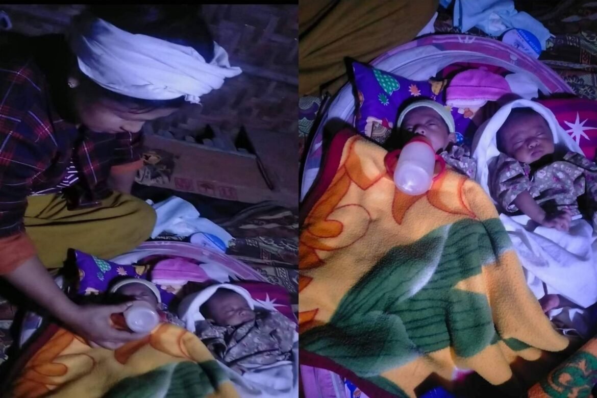 စစ်ကိုင်းတိုင်း၊ ခင်ဦးမြို့နယ်မှာရှိတဲ့ စစ်ဘေးရှောင်စခန်းတခုမှာ ခိုလှုံနေကြရတဲ့ ၁ လအရွယ် အမွှာကလေး ၂ ဦးမှာ ၁ ရက်လျှင် နို့ဘူးတလုံးတည်းကို ၂ ကြိမ်တိုင်တိုင် မျှပြီးစို့နေရတယ်လို့ သိရပါတယ်။